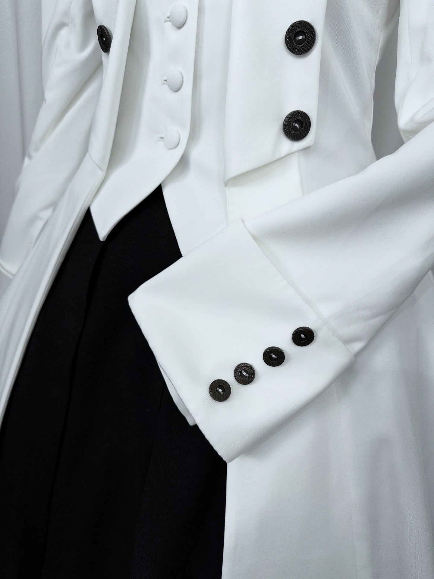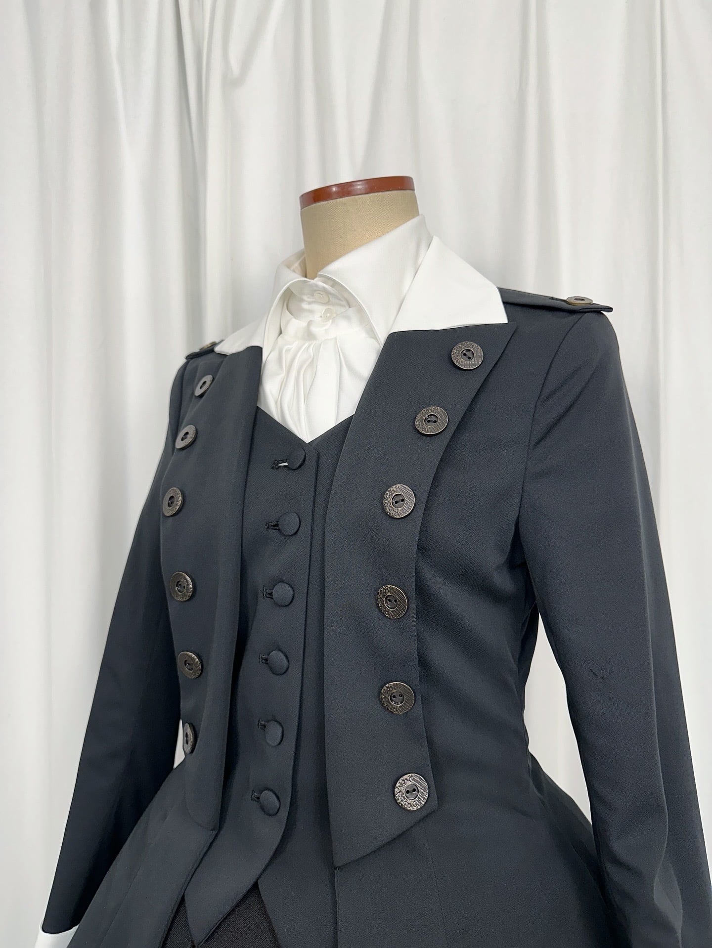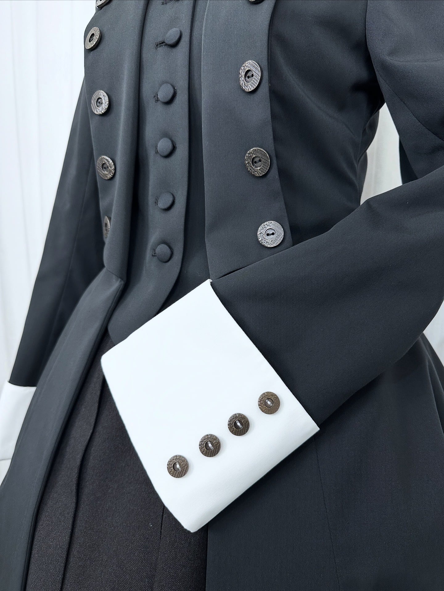 共布で仕立てた大ぶりのカフス、肩章、ナポレオンを想起させる折り返しラペルが統一感のある佇まいを描きます