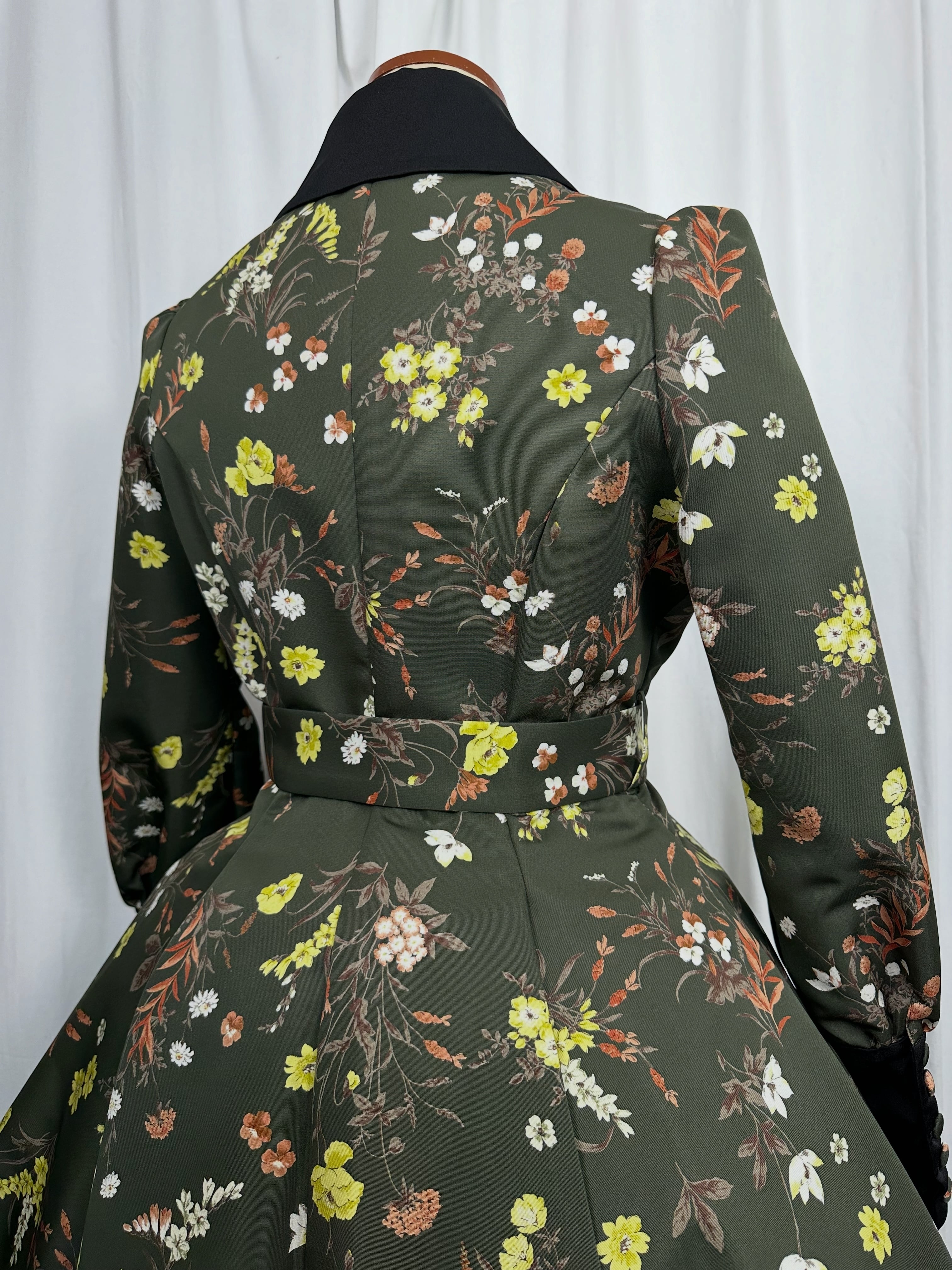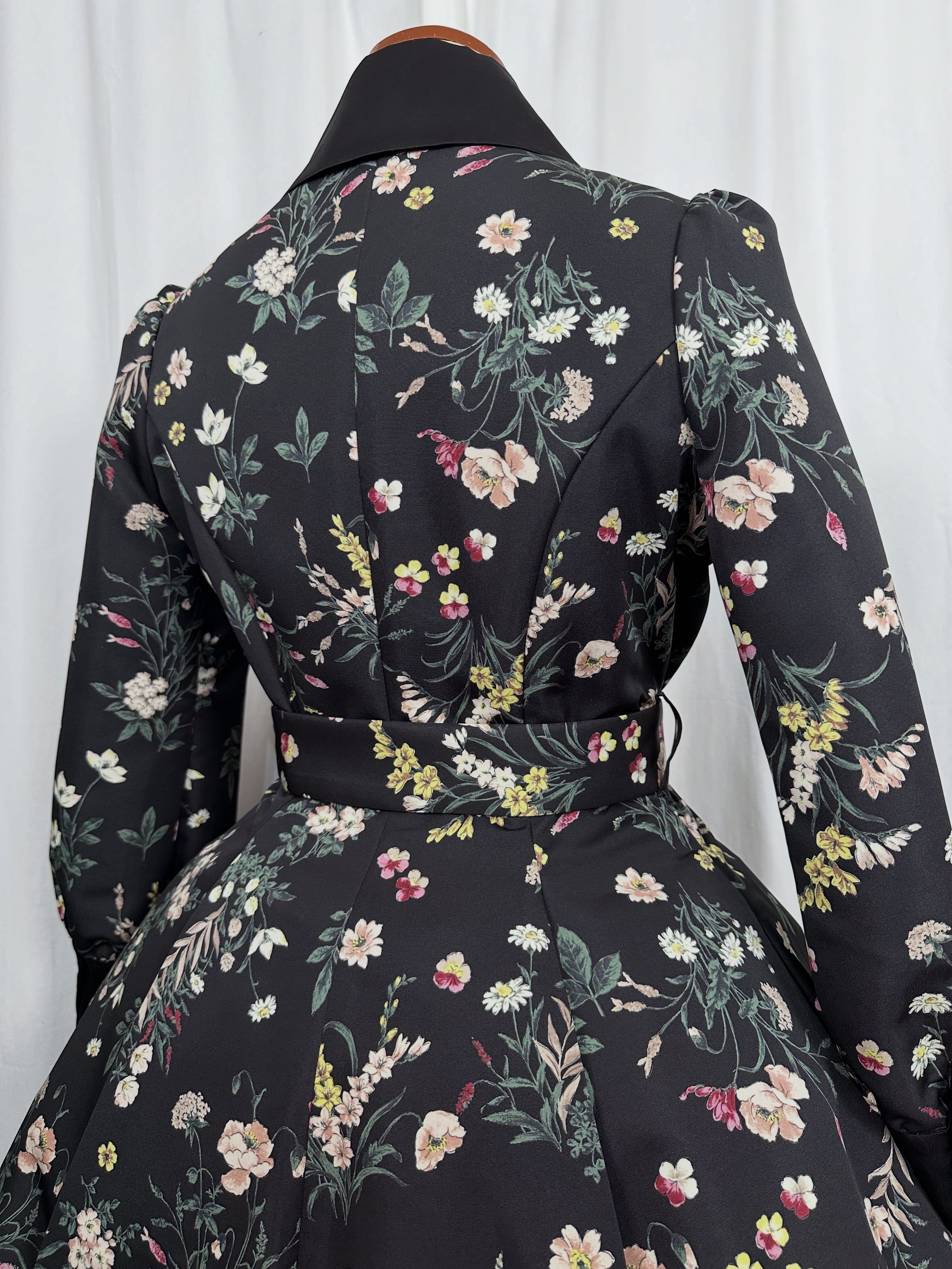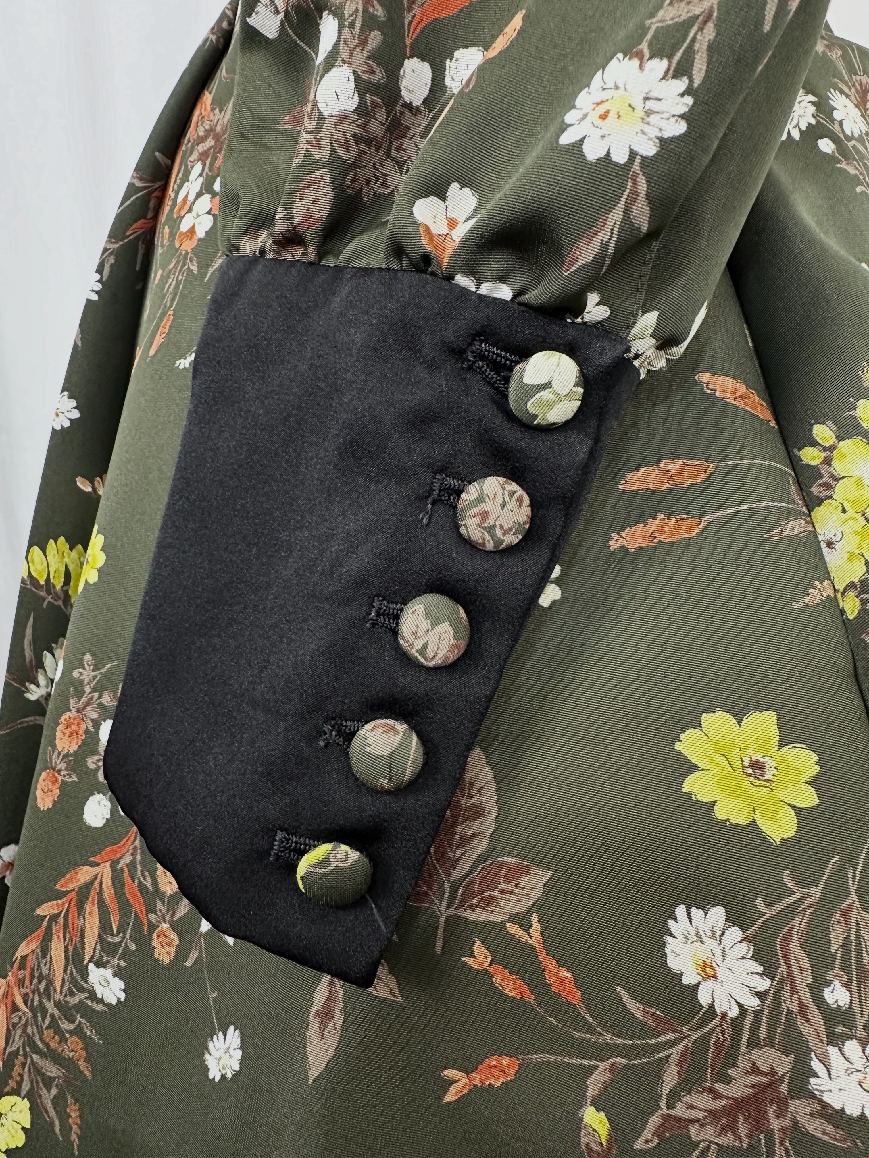 ヴィンテージの壁紙や古いタペストリーを思わせる、装飾的な花柄プリントのグログラン生地を使用