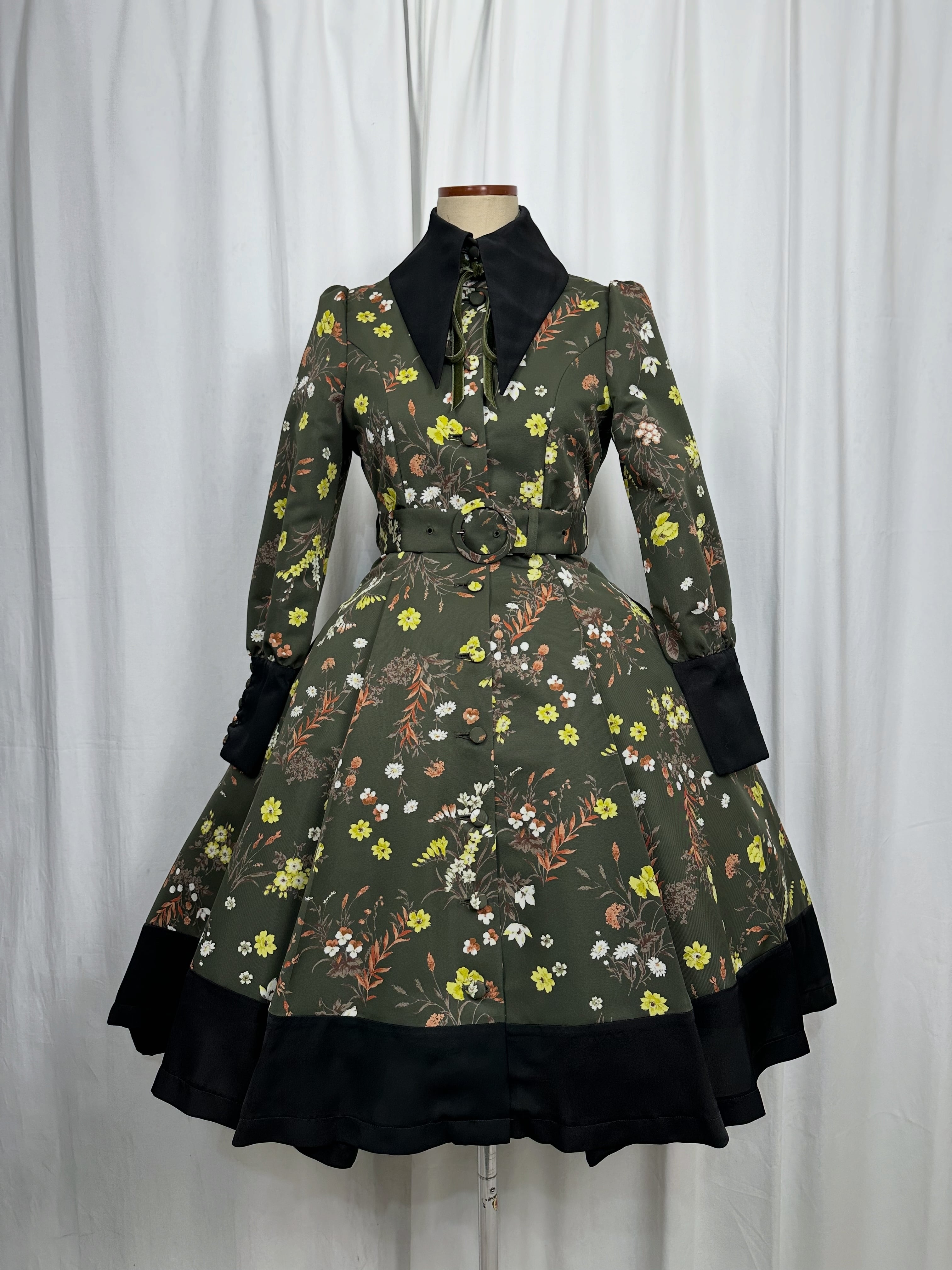 大きな襟とウエストベルトが特徴的なワンピースの登場です