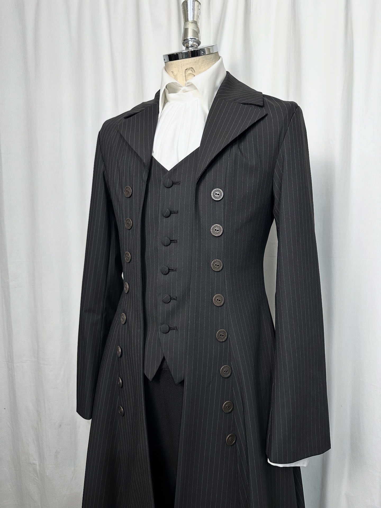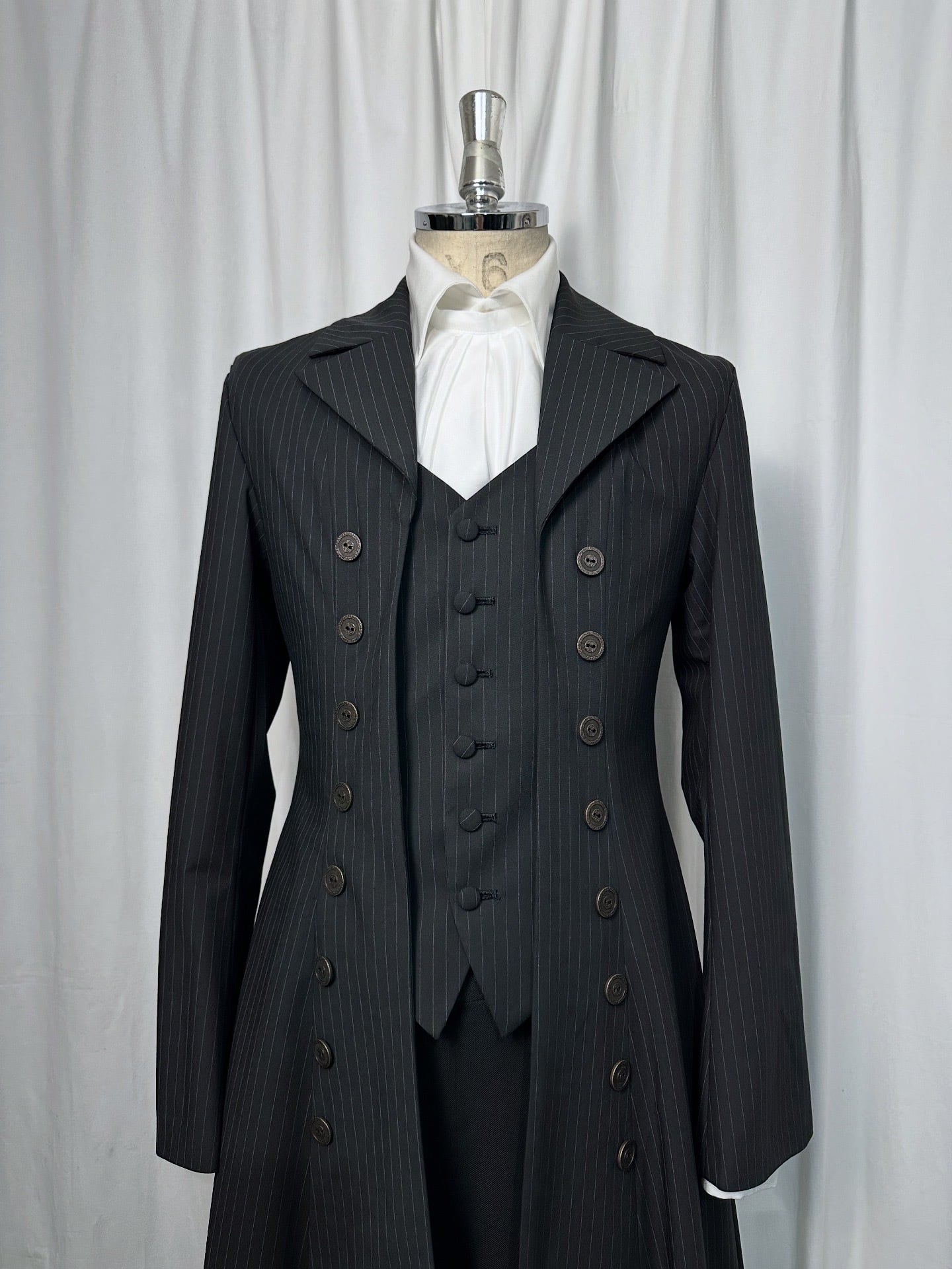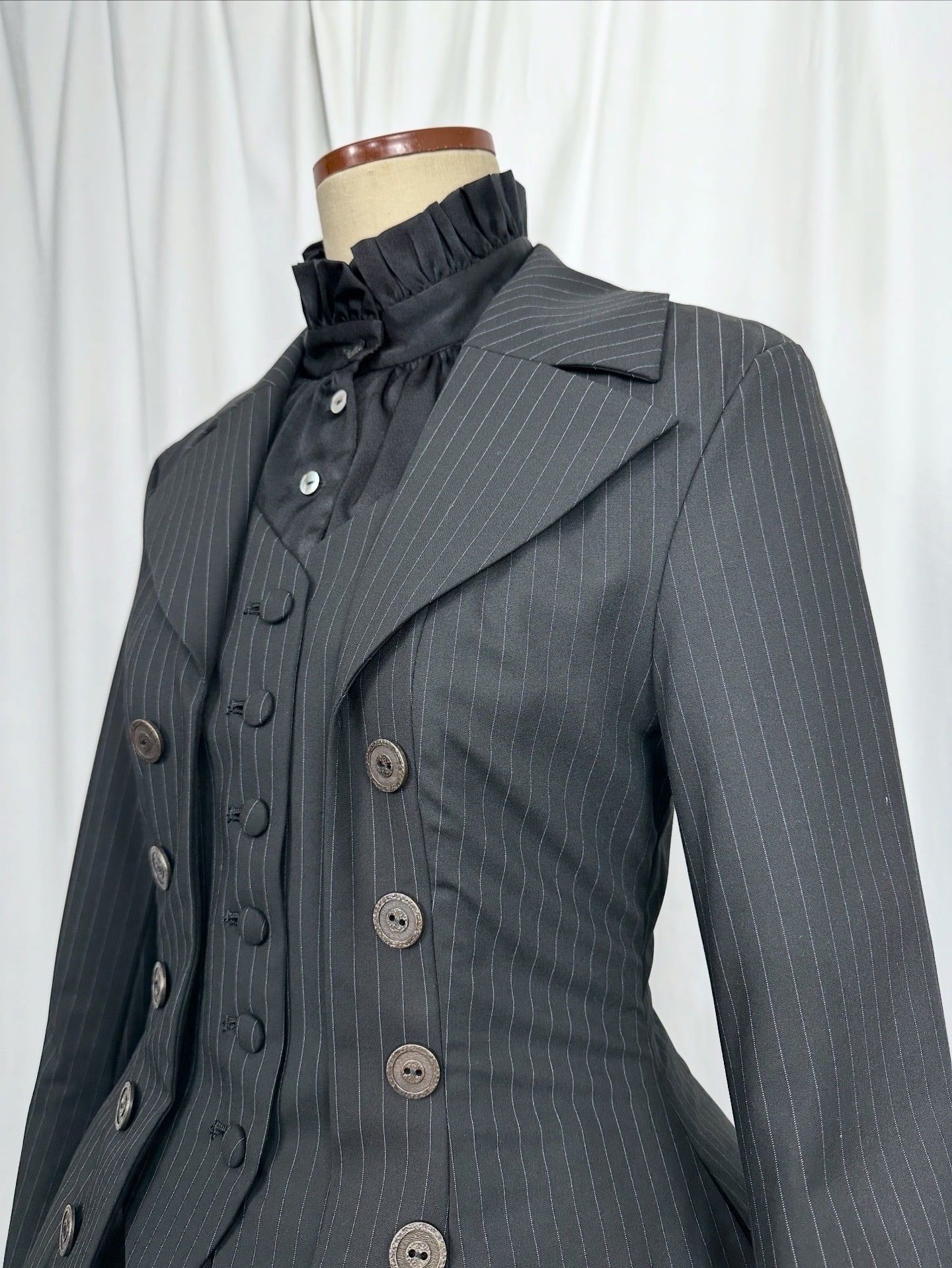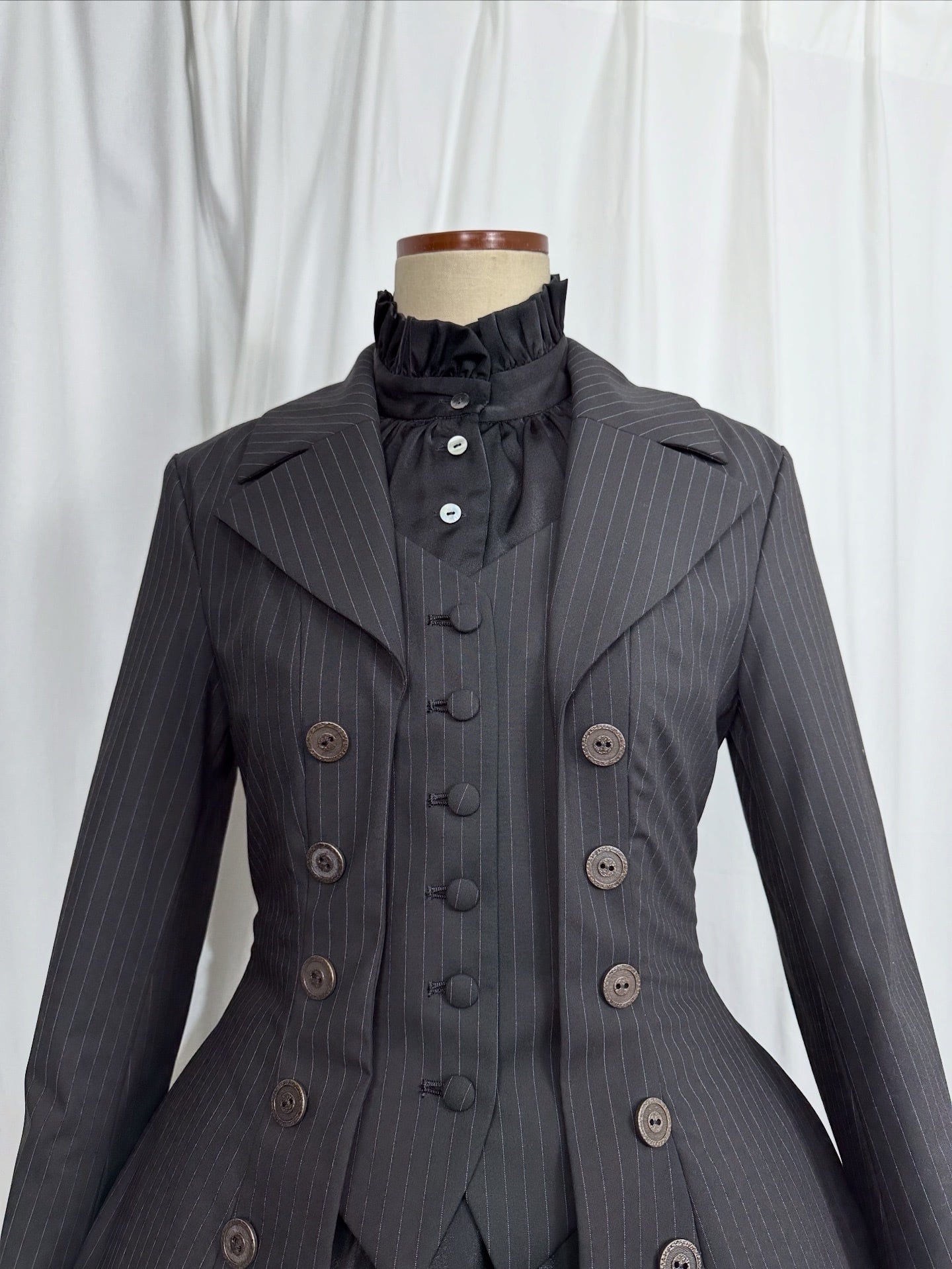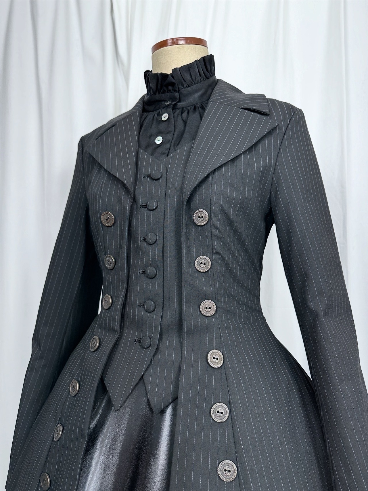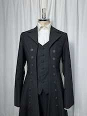 共布で作られたフロントのクルミ釦、ダブルに配置された装飾釦が印象的です
