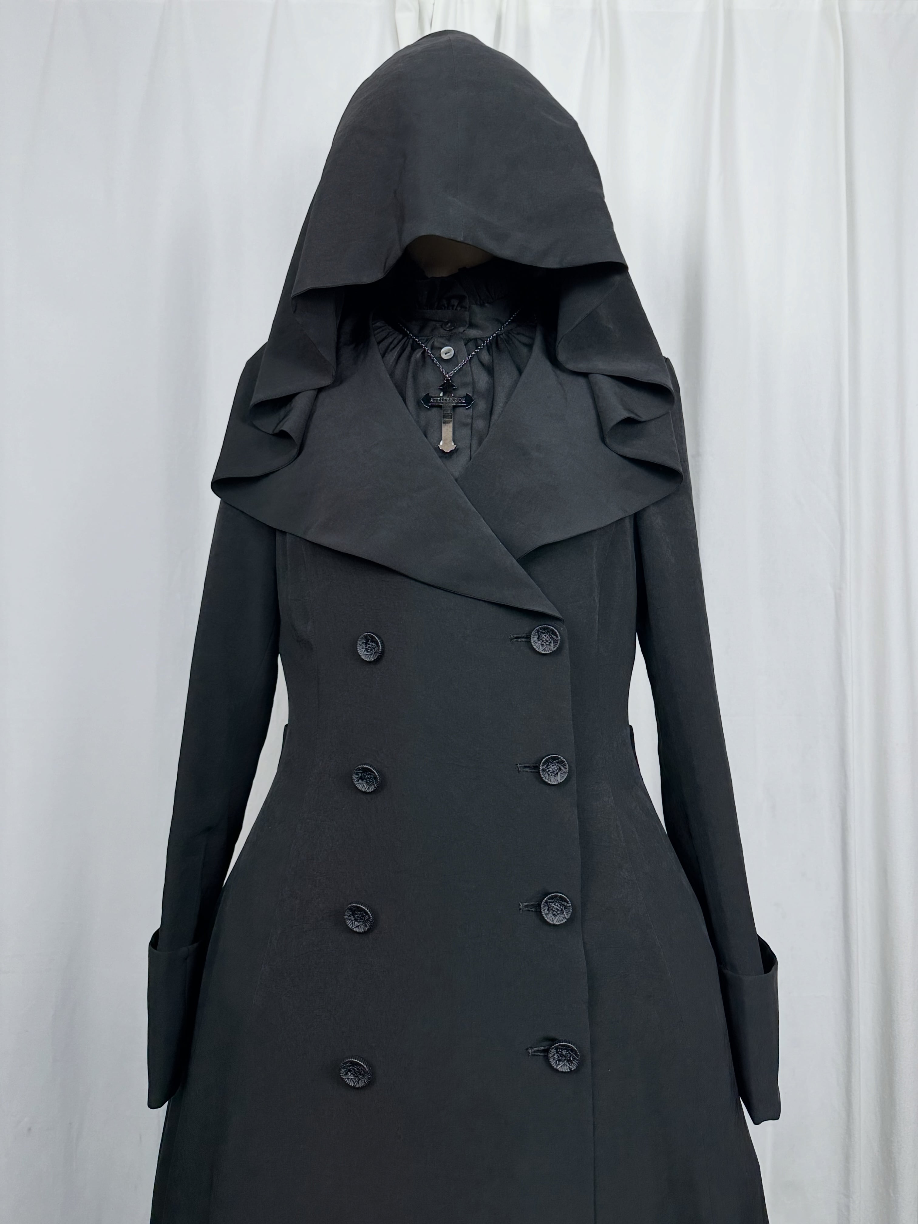 ダブル仕立てによるクラシカルな重厚感と、フードがもたらす神秘的な印象が重なりまるで黒衣の魔女を思わせる佇まいに仕上がりました