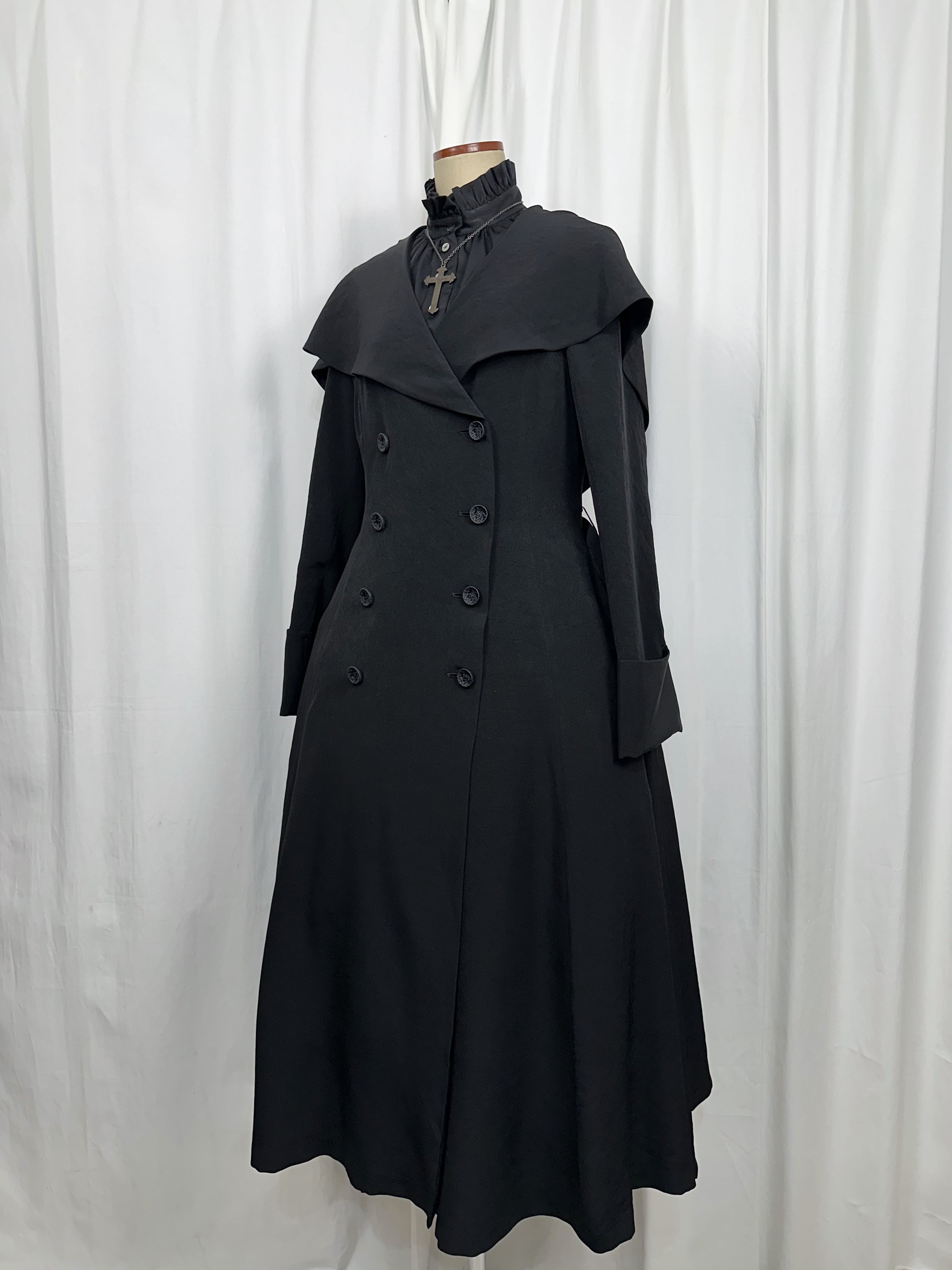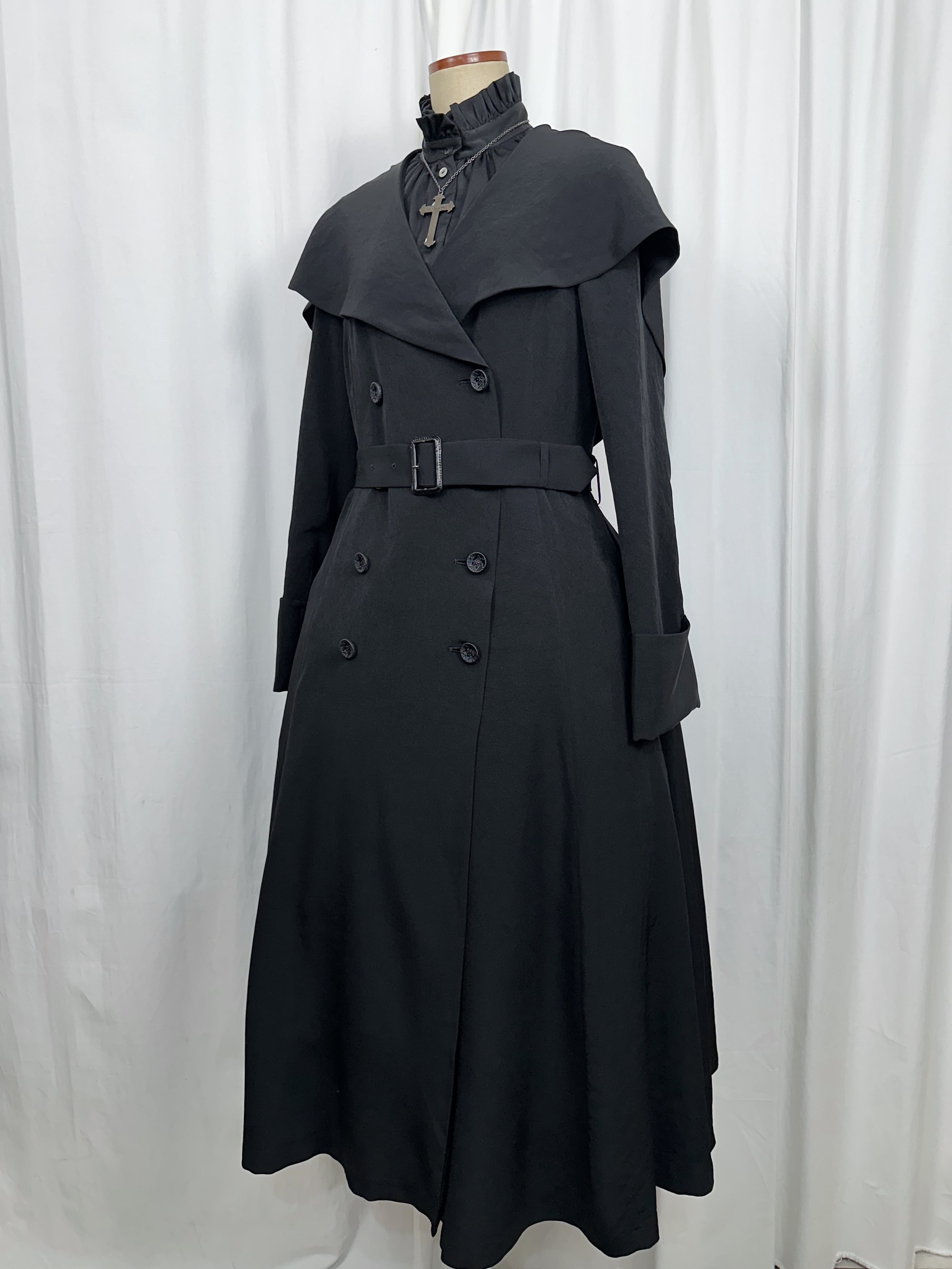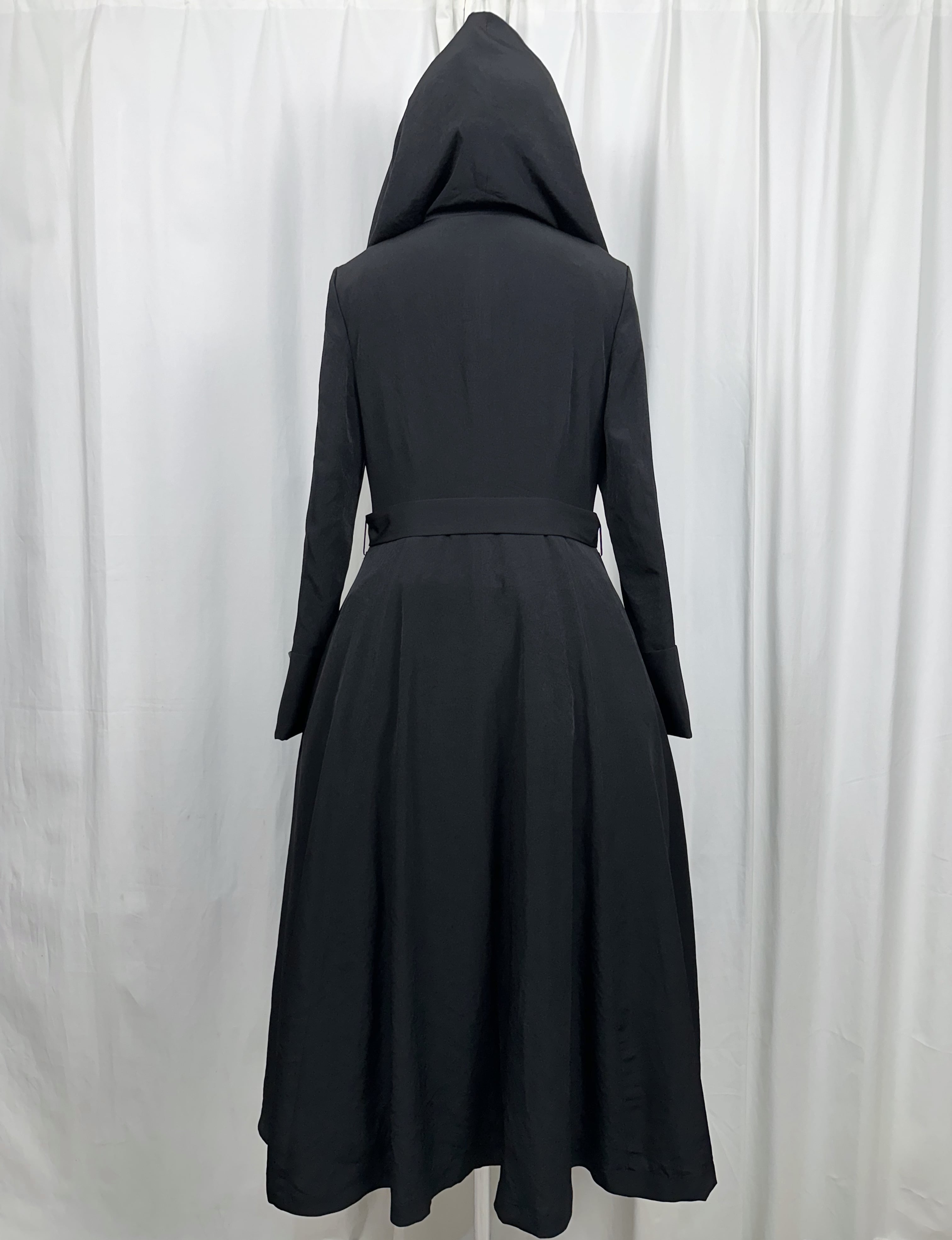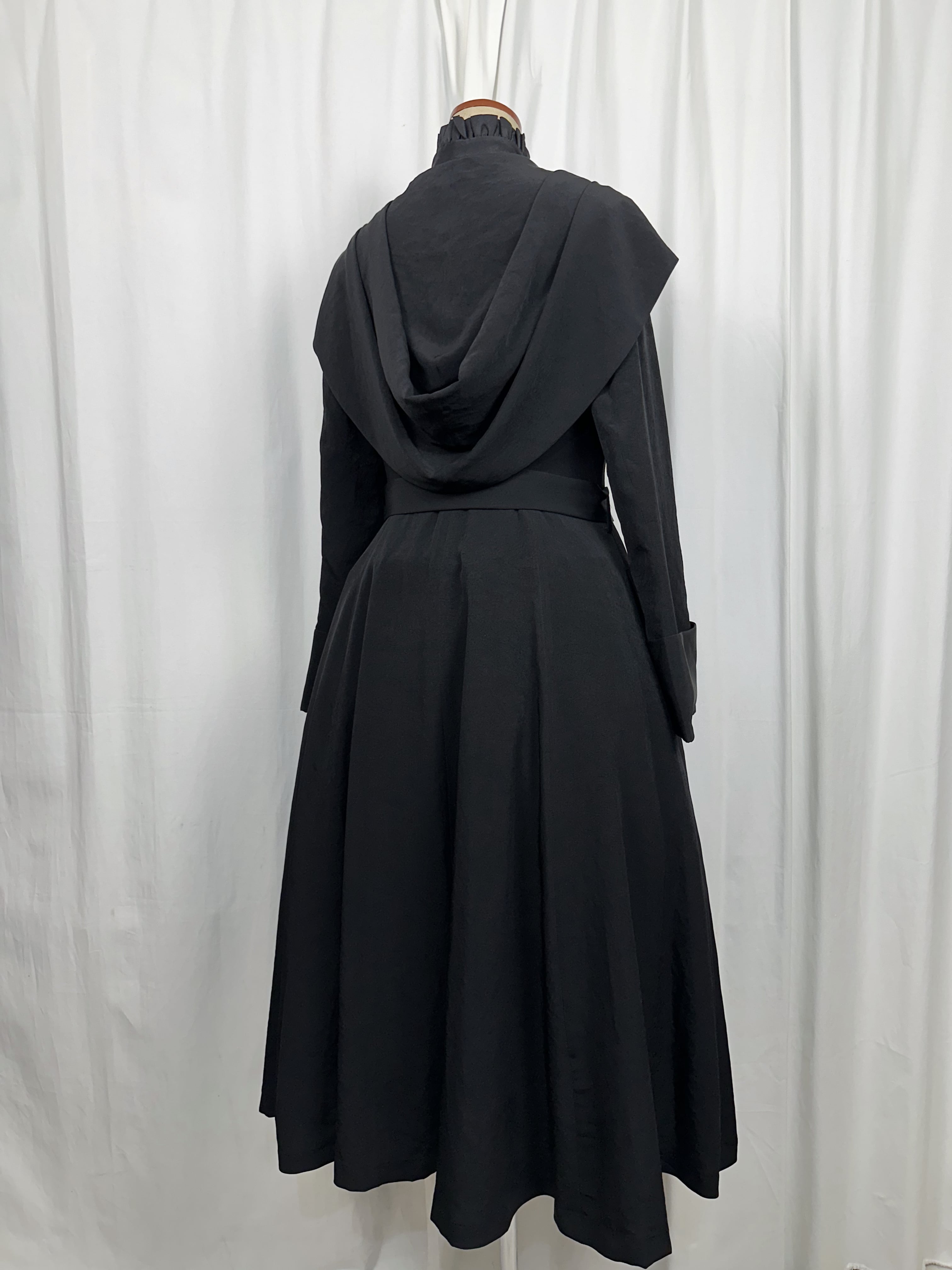 喪服の静けさと、魔女のローブのような幻想性を併せ持つローブコートの登場です