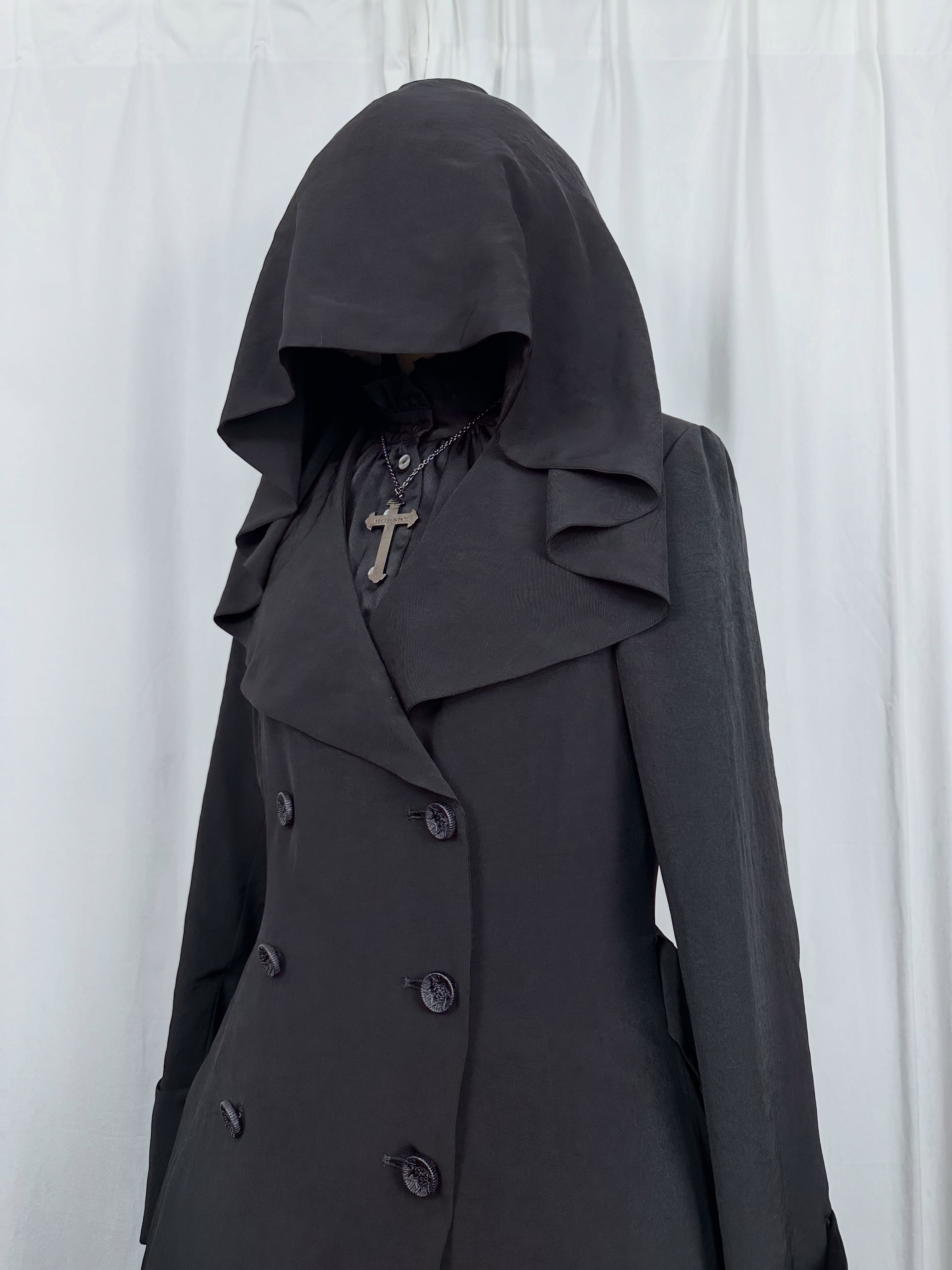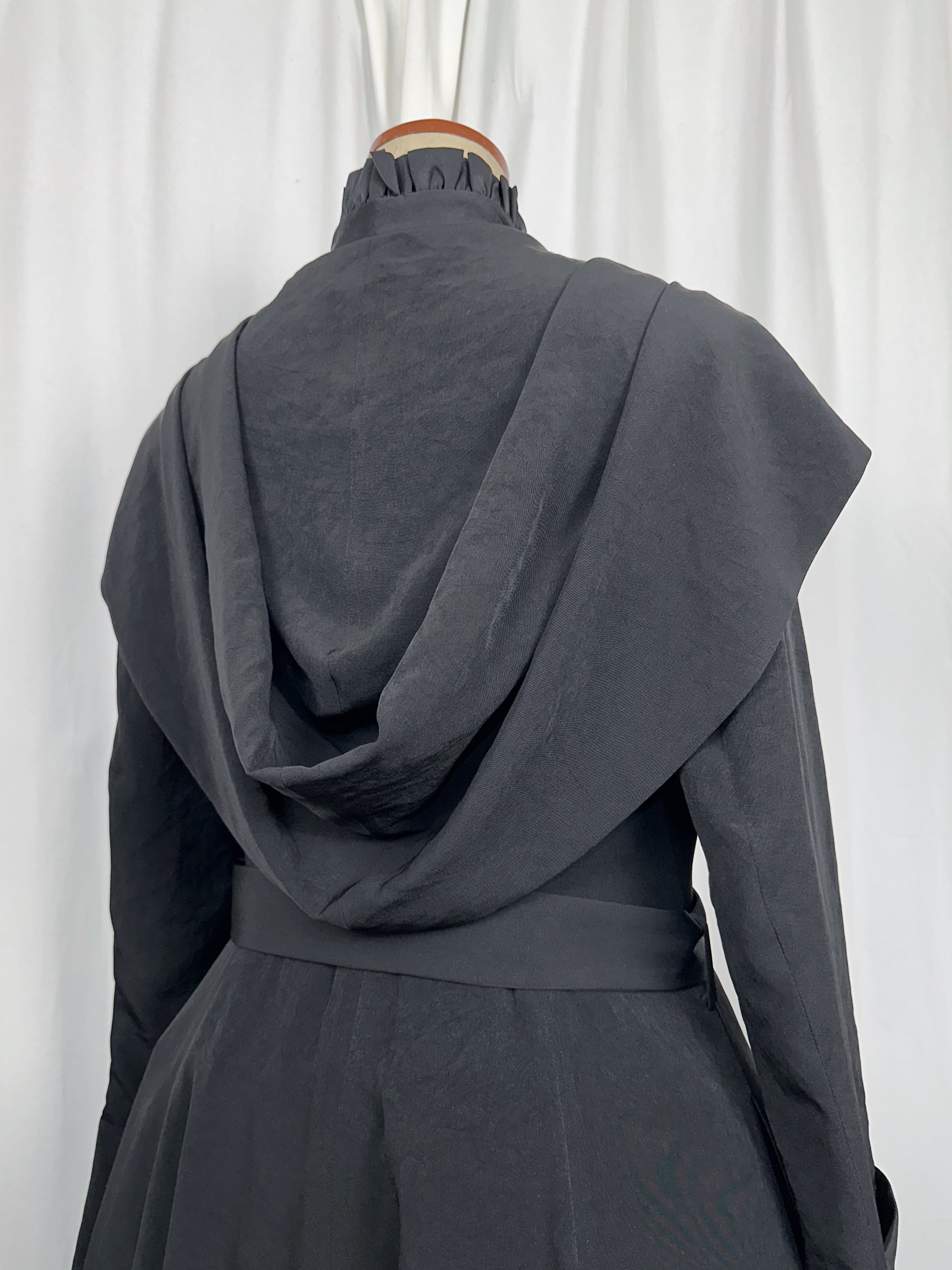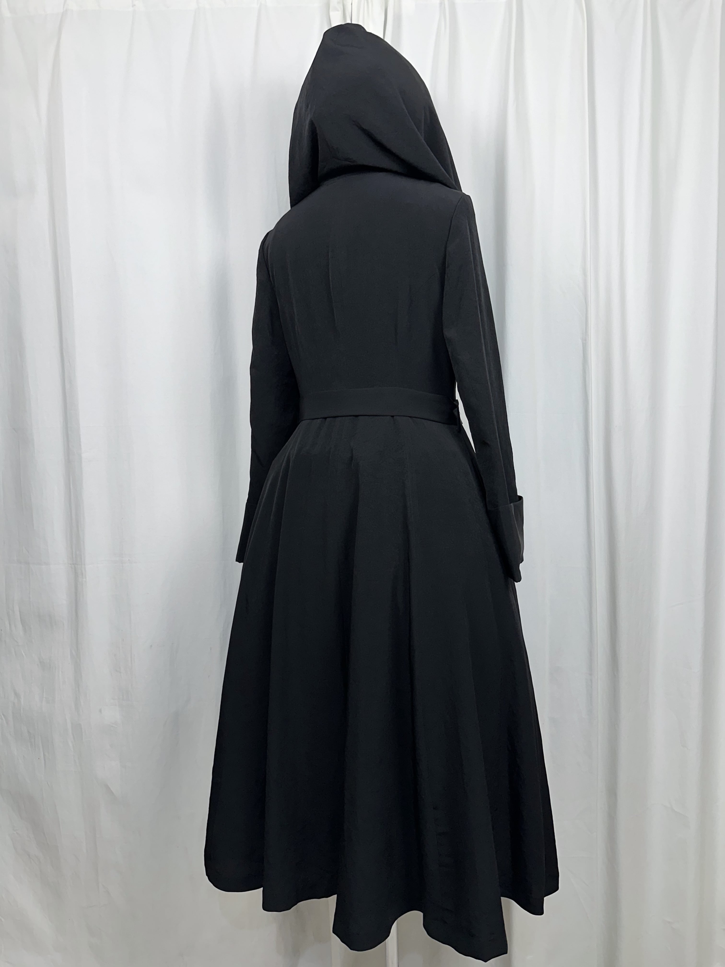 喪服の静けさと、魔女のローブのような幻想性を併せ持つローブコートの登場です