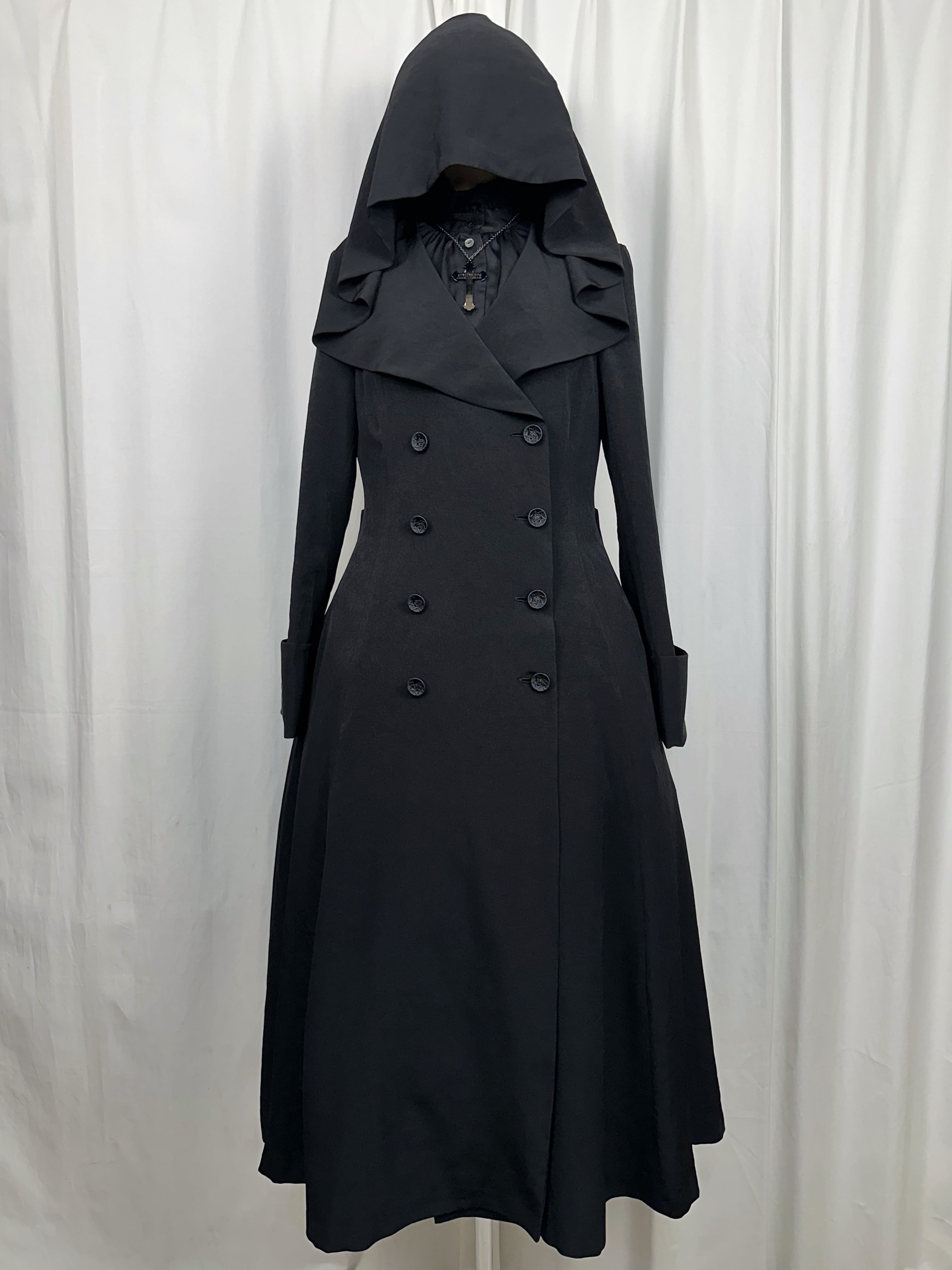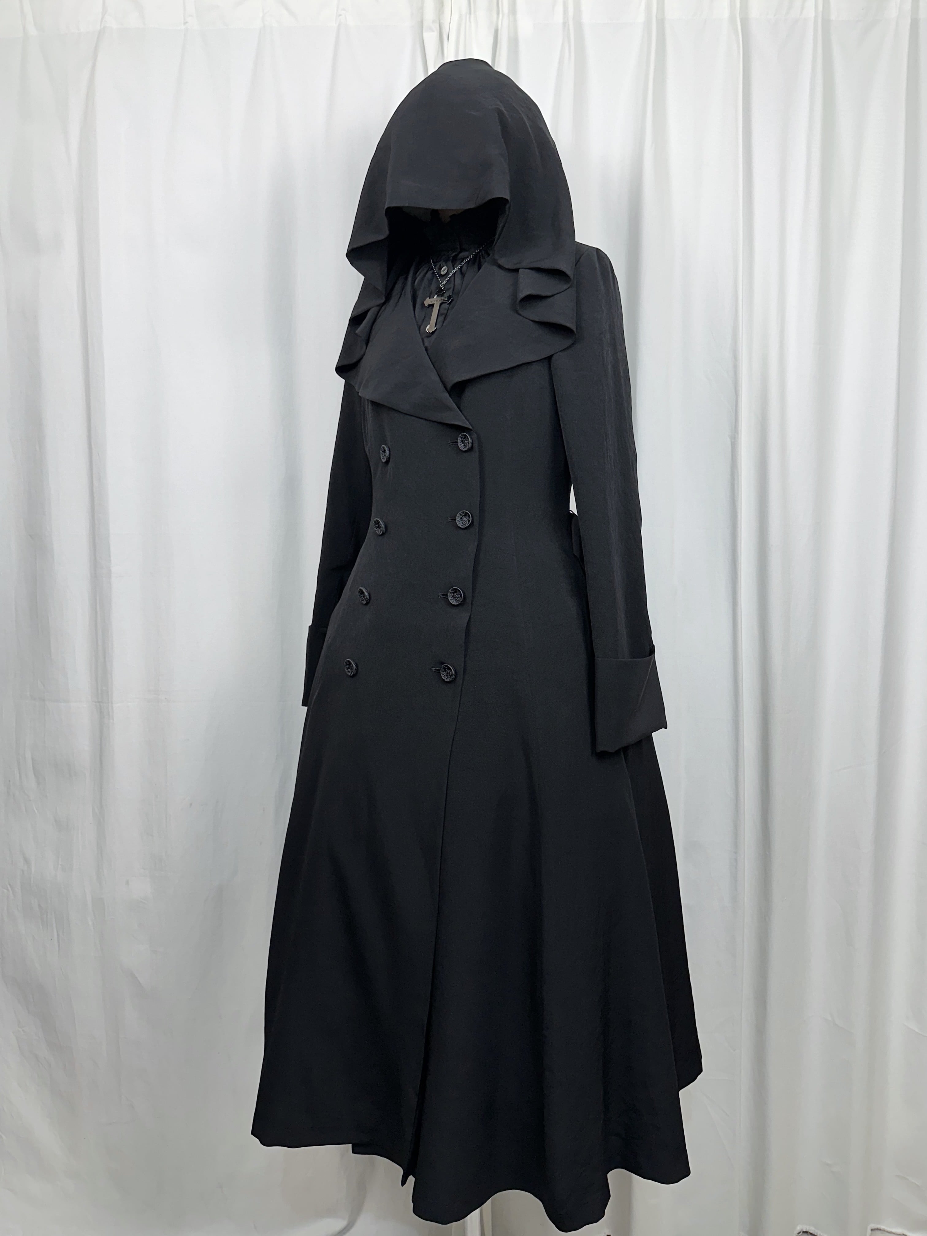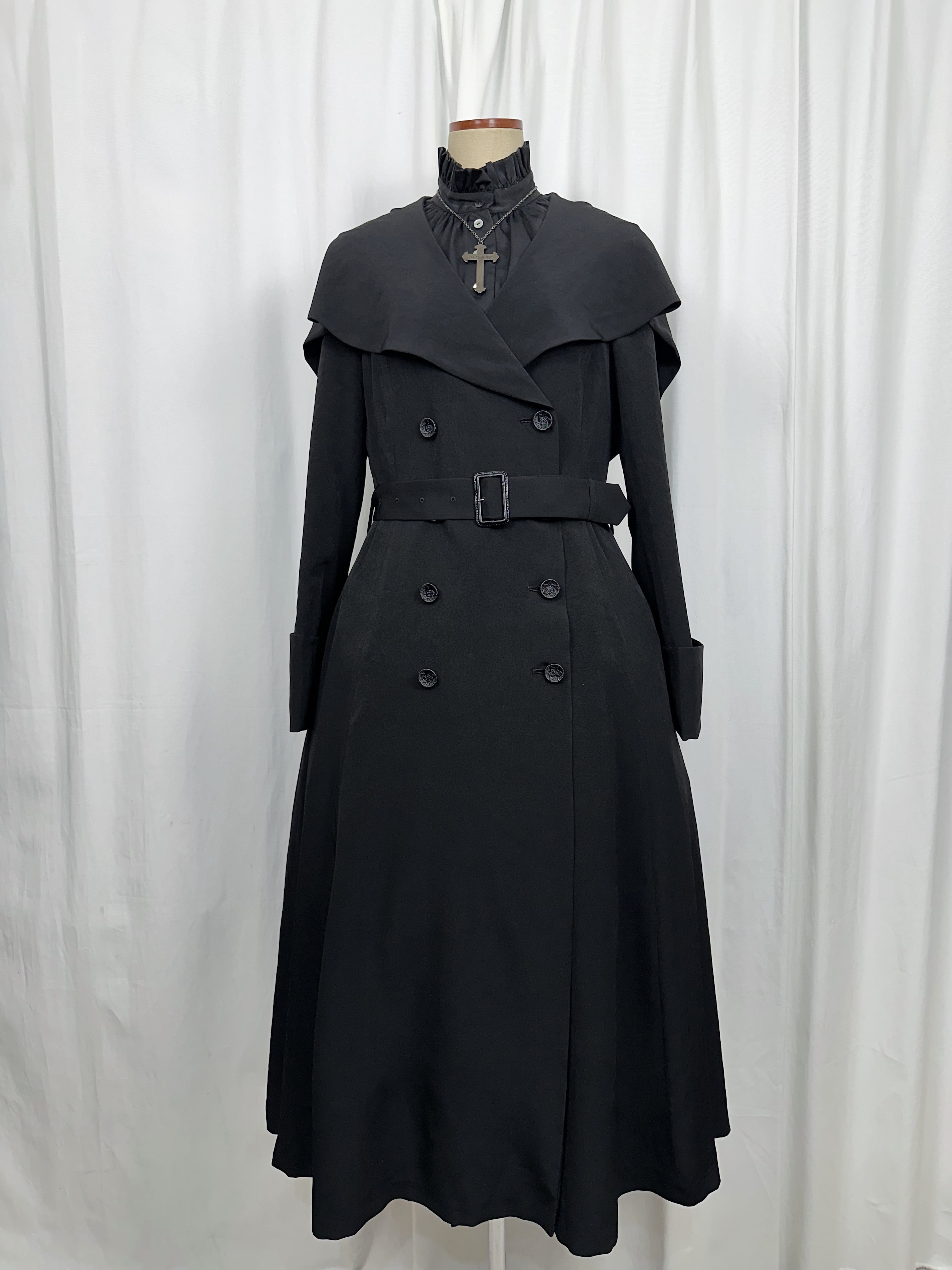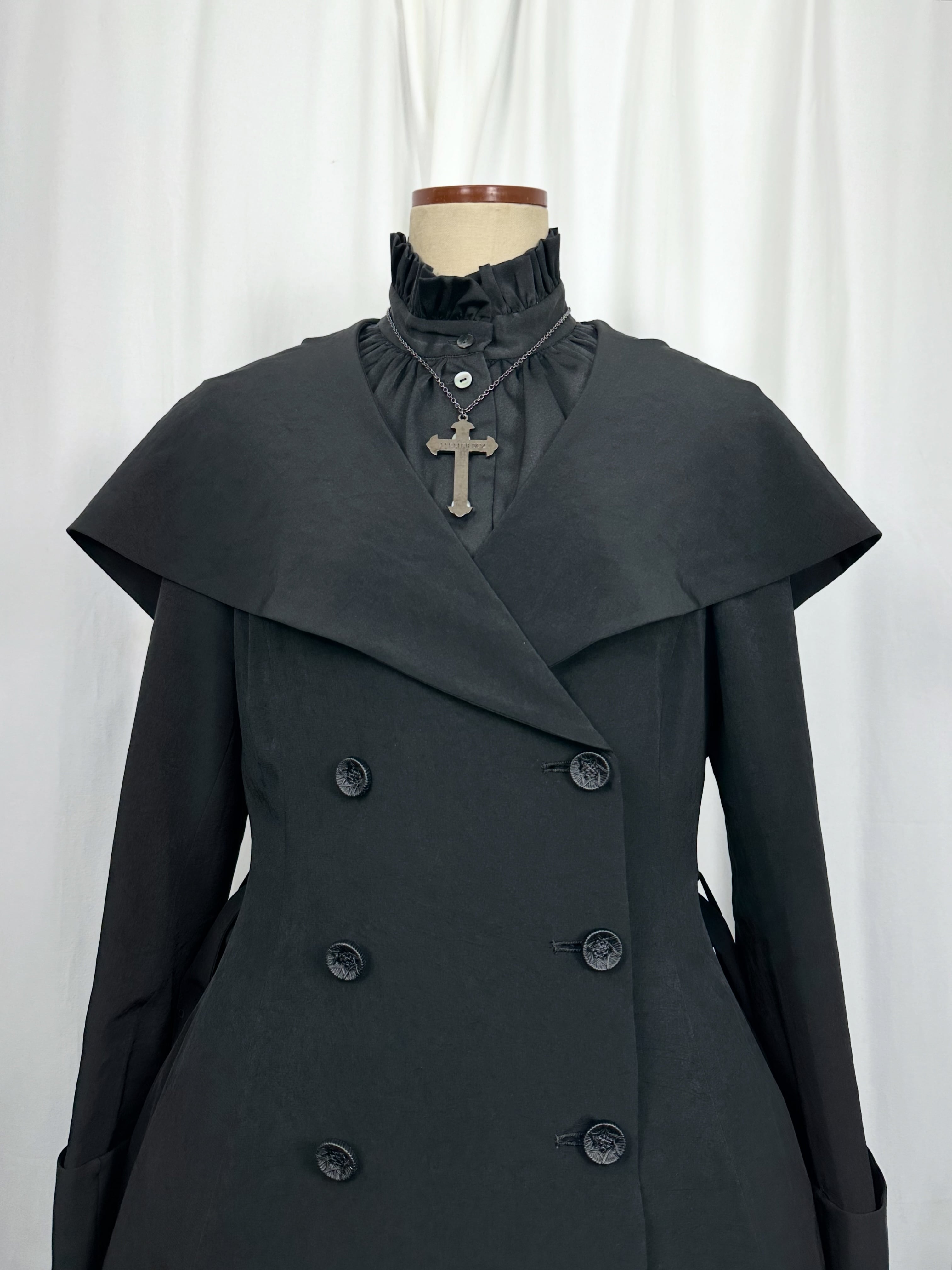 喪服の静けさと、魔女のローブのような幻想性を併せ持つローブコートの登場です